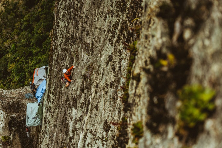 When the idea of climbing the wall came up, we thought it would be interesting to have someone who’s local and another Brazilian on the wall. Three people popped up: Alex [Mendes], who I tried the wall with in 2020. The next one was a mentor of ours: Chiago. The third guy was this rasta Brazilian cowboy. I texted him, “Hey, want to go on a climbing adventure?” He didn’t know which wall it was until a week prior. He had never been on a big wall. I taught him how to jug at the base.