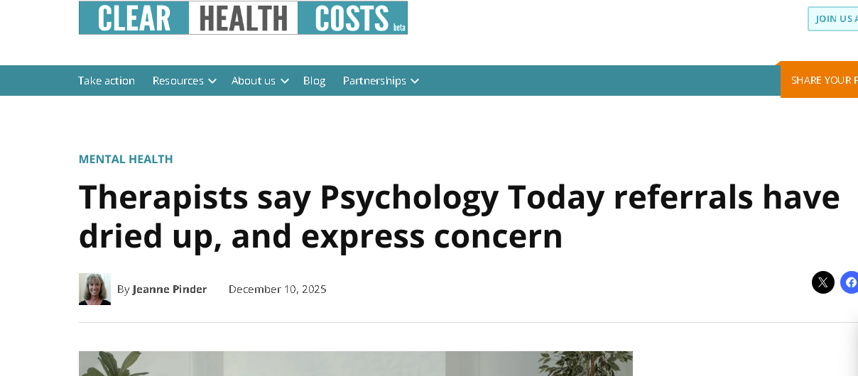 There are also strong suspicions in the profession that these PMCs have started controlling the flow of patients, through both their work with insurance referrals and other possible tactics. The main marketing funnel for therapists, Psychology Today, provides therapists the best way to get into Google search. But there has been a dramatic drop in referrals, starting 18 months ago.