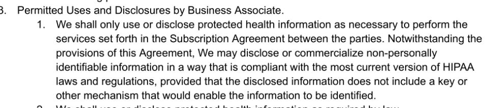 We don’t sell or commercialize therapy data, and we don’t use it for advertising. We only use de-identified data for internal product improvement (e.g. improving note quality and performance), in line with HIPAA. We’ve updated our BAA language to make that clearer, since the prior wording could be misinterpreted.