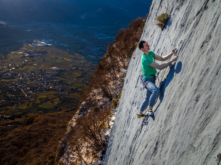 Yet Ondra isn’t the only climber of late to come to the defense of this unpopular style. Arco-born climber Pietro Vidi—who, according to Ondra, dubbed the slab of his hometown “meh” compared to Yosemite—recently became the first to repeat Lurking Fear (5.13c), 25 years after its first ascent. Vidi went on to send some gnarly, slabby testpieces in the UK’s Peak District.