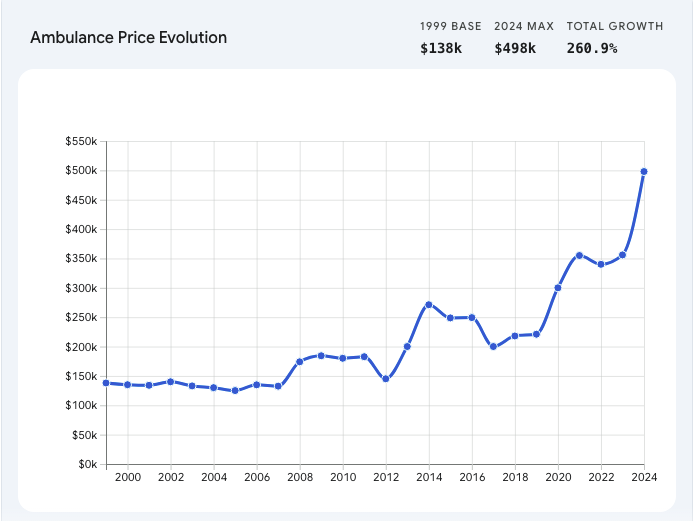 But there’s also been a change in the market structure. The industry was once defined by relatively stable costs—for example, Winter Springs, Florida paid $135,000 per ambulance in 2000, while Natick, Massachusetts paid $132,600 for a new ambulance in 2007, often delivered within a 120-day window.