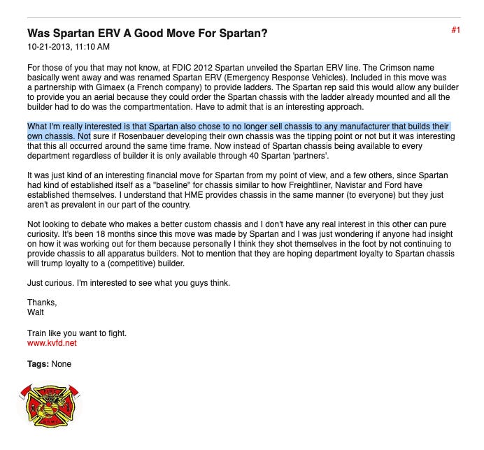 Since 2020, REV Group has focused Spartan primarily on supplying fire apparatus chassis to its own fire truck brands and limited fire chassis sales to outside buyers who agree not to make, or plan to make, their own chassis. Current President of REV Fire Group and REV Specialty Group Mike Virnig led this strategy in his prior role as Spartan’s Director of North American Sales before joining REV Group and pushing to acquire Spartan. In following this strategy, REV Group has boasted to investors that it has been able to “drive margin improvement actions” while reducing its manufacturing production capacity by a third.