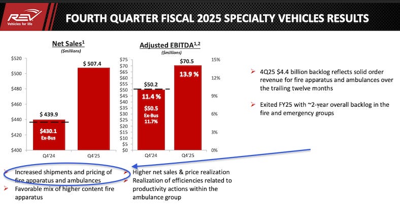 Soon after REV Group went public, its CEO at the time, Tim Sullivan, told shareholders he expected to more than double the profit margins of the companies REV acquired from the historic norm of four or five percent to more than ten percent in short order. This followed a 2018 shareholder call where he declared “[w]e like backlog, we love backlog.” And indeed, REV Group’s choices in the face of exploding order backlogs — such as not even attempting to produce its own ambulance chassis despite owning companies that had previously done so — have proven extremely lucrative. REV Group’s Adjusted EBITDA for its Specialty Vehicles division — the best measure of REV Group’s “operating fundamentals,” according to its management’s SEC reports — has soared dramatically in recent years, increasing by $92.5 million (or 149.2%) from 2023 to 2024, and by an additional $89.7 million (or 65.5%) from 2024 to 2025.