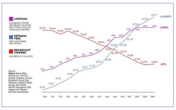 These companies use their market power in a number of ways. The first is simple. Higher prices. Pay-TV providers that have a bundle of channels must pay what are known as retransmission consent fees to the local broadcast affiliates to use their content. They then pass those fees on to the end consumer, who sees it in a higher bill from Hulu or Xfinity or whatever their service is. Here’s a graphic from a Nextstar’s investor document making the point.