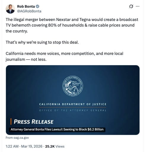 Today, in an unusual assertion of state law enforcement against corporate power, eight state attorneys general, led by California AG Rob Bonta sued to block the Nexstar/TEGNA merger.