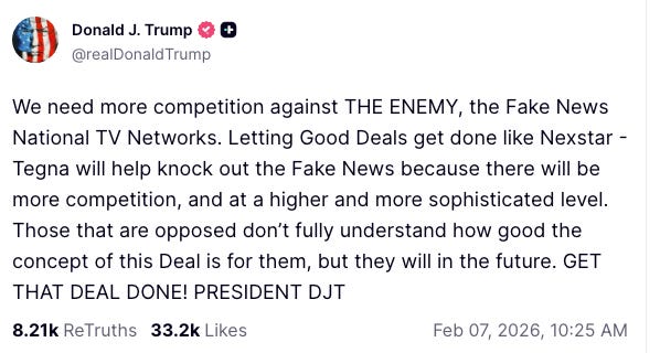 His Federal Communications Commission Chair, Brendan Carr, then greenlit the deal, and there’s little chance the Federal Antitrust Division does anything. Carr also has to change media ownership rules to allow a broadcast media company to reach more than 39% of the American public, which he is in the process of doing.