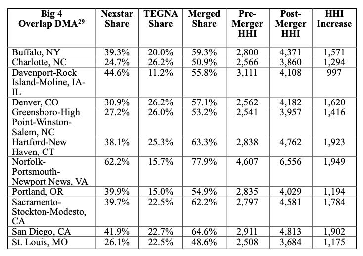 To really understand how much market power Nexstar will gain, you have to look at local market shares. To sell into an area and use broadcast content, you have to license from the local affiliates. And here are the market shares of revenue in certain local areas for the combined company, between 50-70% across a host of cities.