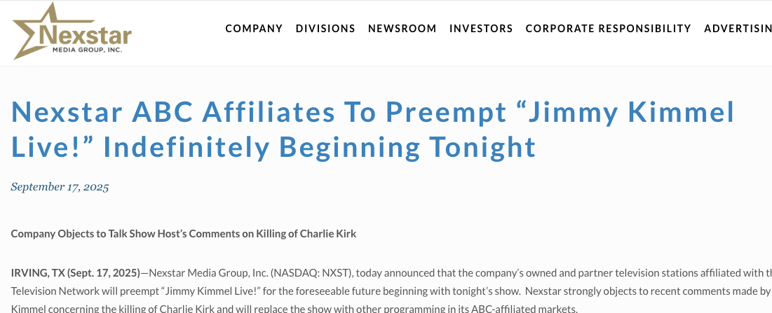 That said, it seemed to conclude with a reasonable ending - the backlash to Disney/ABC was so significant that Kimmel got his show back. You might think that would be the end of the saga. But it’s not.