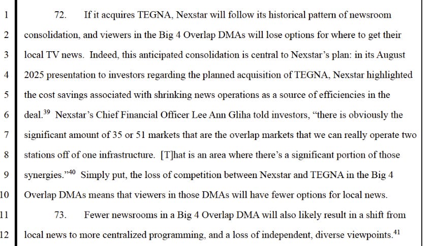 Nexstar and TEGNA will make a number of arguments. They will say that the market is not local broadcast retransmission fees, but a more expansive media universe, including websites, on-demand streaming services, and apps. They will point to the increasing prevalence of sports programming going onto streamers directly, ESPN Plus, Amazon Prime, and so forth. They will also point out that government experts at the FCC and Antitrust Division cleared the deal, so why would the states know any better?