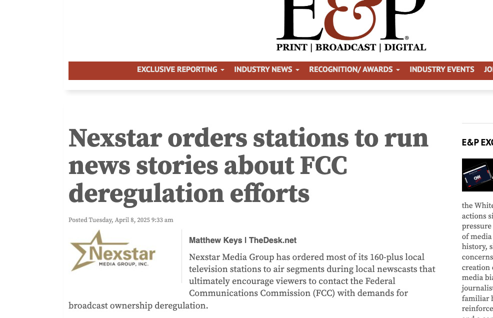 Indeed, the Kimmel choice is consistent, not with partisan favoritism, but promoting political views that foster more market power for these holding companies. For instance, in April of last year, Nexstar ordered local news across its 160 stations to air stories promoting local cable deregulation.