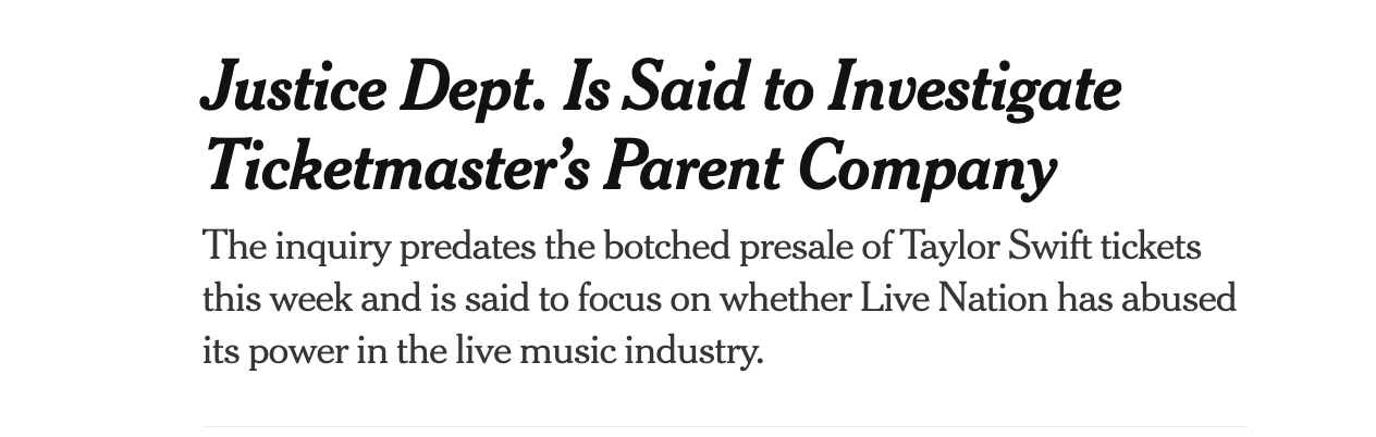 Before getting to the full round-up, I want to focus on Ticketmaster/Live Nation. This week, a jury is going to hand in a verdict, perhaps as soon as tomorrow, on whether the company is an illegal monopoly. And Ticketmaster, more than any other monopolist, represents the obvious lawlessness among elites that we’ve been seeing for decades. I don’t know which way the jury will go, but to even get to a point where there might be some level of justice for a company this loathed and yet so untouchable is a big deal.