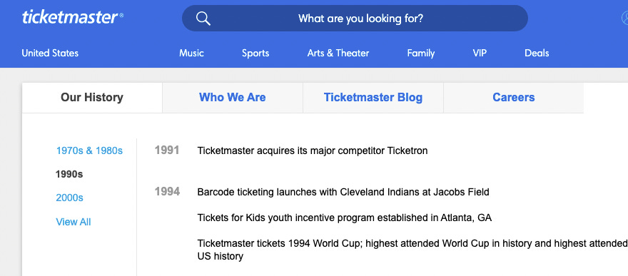 Over the next decade and a half, Ticketmaster bought up much of its competition, using mergers, pricing strategies, exclusive deals, and steering arrangements to gain control over ticketing. This roll-up strategy was so obvious that the company posted on its own website that it acquired “its major competitor Ticketron” in 1991. In a traditional legal environment, this statement would amount to a confession of violating the Clayton Act, but so feeble had enforcers become that it was merely a way to brag to investors.