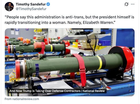 Trump is addressing a real problem; the defense base is a mess, a mix of extreme financialization and monopoly power. I traced the issue in 2023 with a piece titled “The Military-Industrial Stock Buyback Complex.” For instance, one of the bottom feeders of the industry - Transdigm - just bought another sole source government contractor, this one called Stellant Systems, and is about to rip us off again by hiking prices on components by thousands of percent.