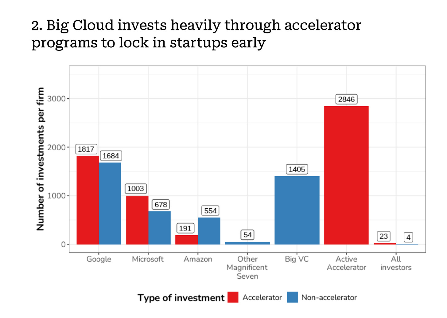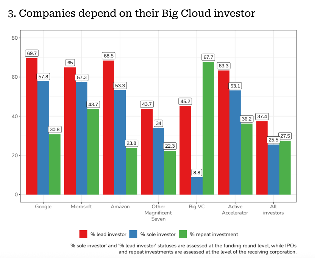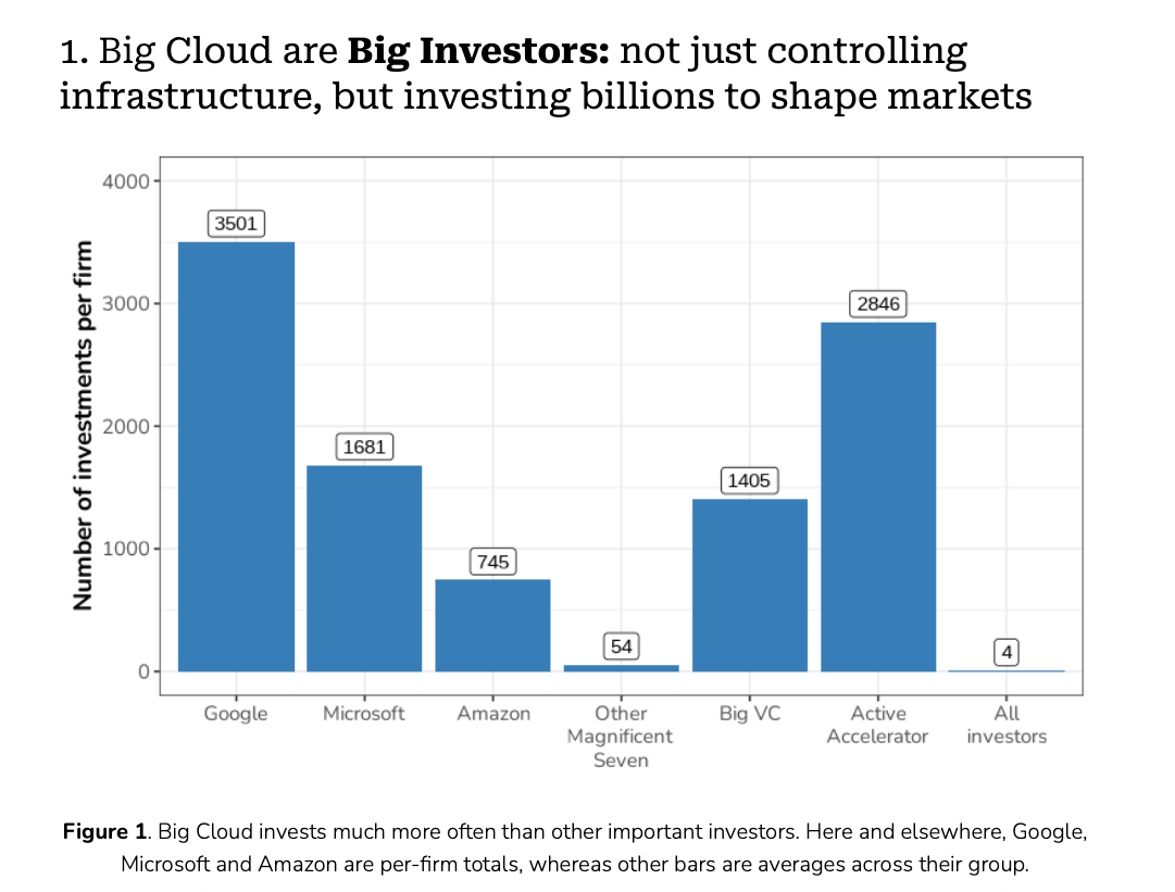 Big Cloud invests as frequently and at similar amounts to the largest venture capital firms and startup accelerators. Further, Big Cloud invests about ten times as often as other Big Tech companies, and ten to a hundred times more in total dollar amounts.