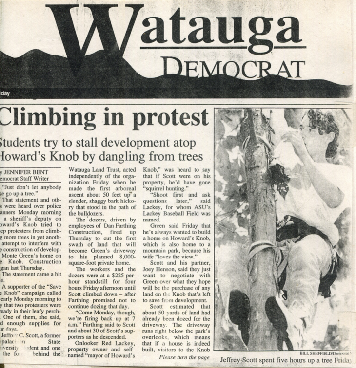 Jeffrey had been a frat boy at the business school. He hiked the AT [Appalachian Trail] and became an environmentalist. He saw the Howard Knob thing, jumped in, and helped take it to the next level. I showed him how to double-back his harness and do a girth hitch as he went up the tree.