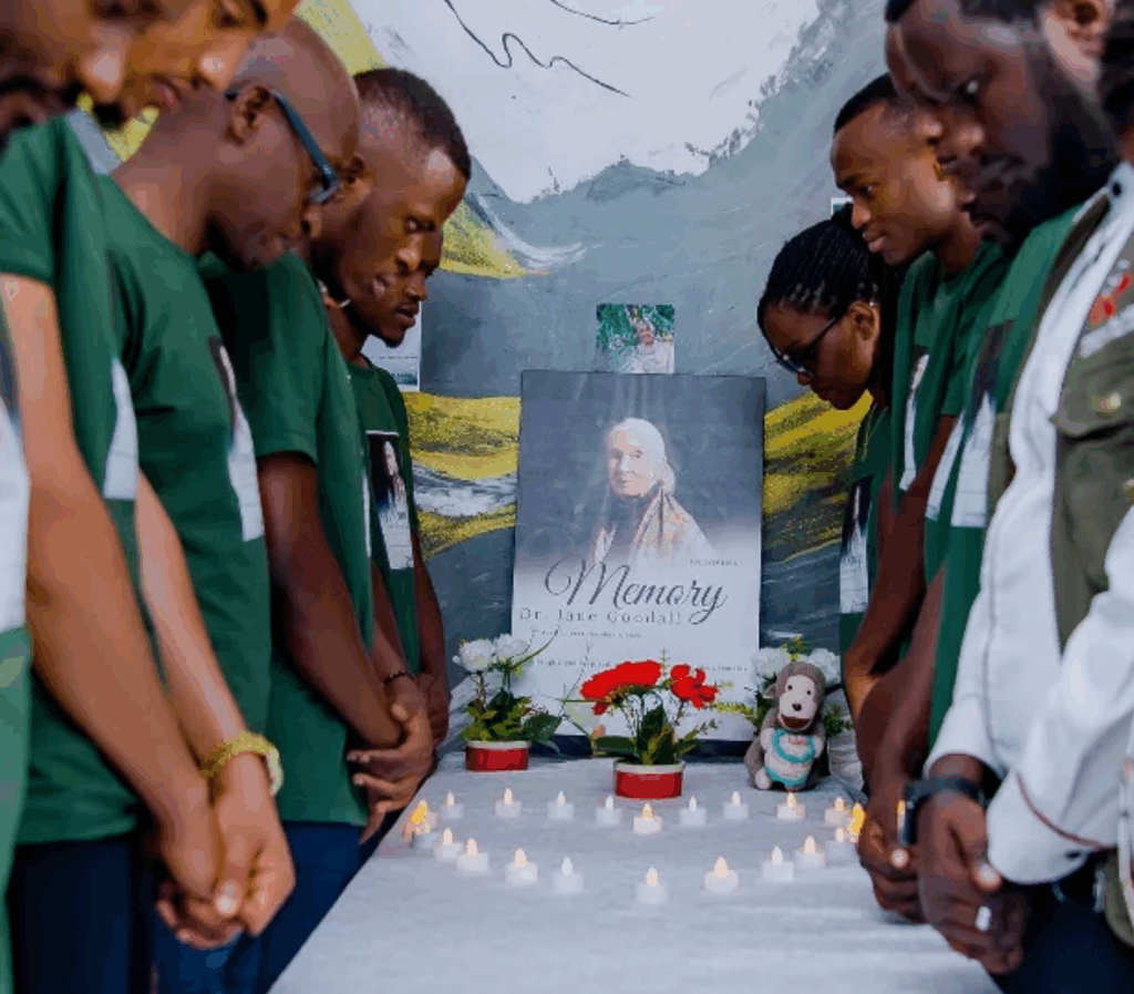 Members of Roots & Shoots Rwanda gathered with JGI staff and friends at Dream Village Rwanda to celebrate Jane’s life with a solemn minute of silence followed by heartfelt words of comfort and hope.