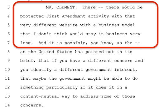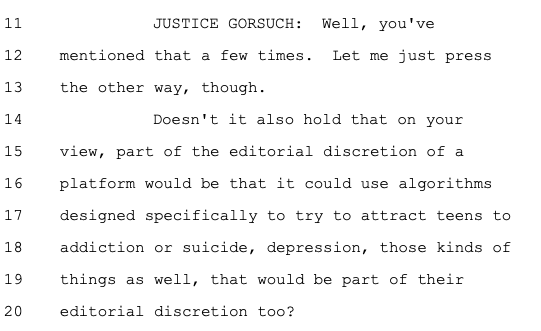 This strange view of free speech has created a disconnect of libertarian legal elites towards basic morality. Indeed, in 2024, Paul Clement, a lawyer for a Facebook and Google trade association, told the Supreme Court that algorithms fostering suicide had First Amendment protections.