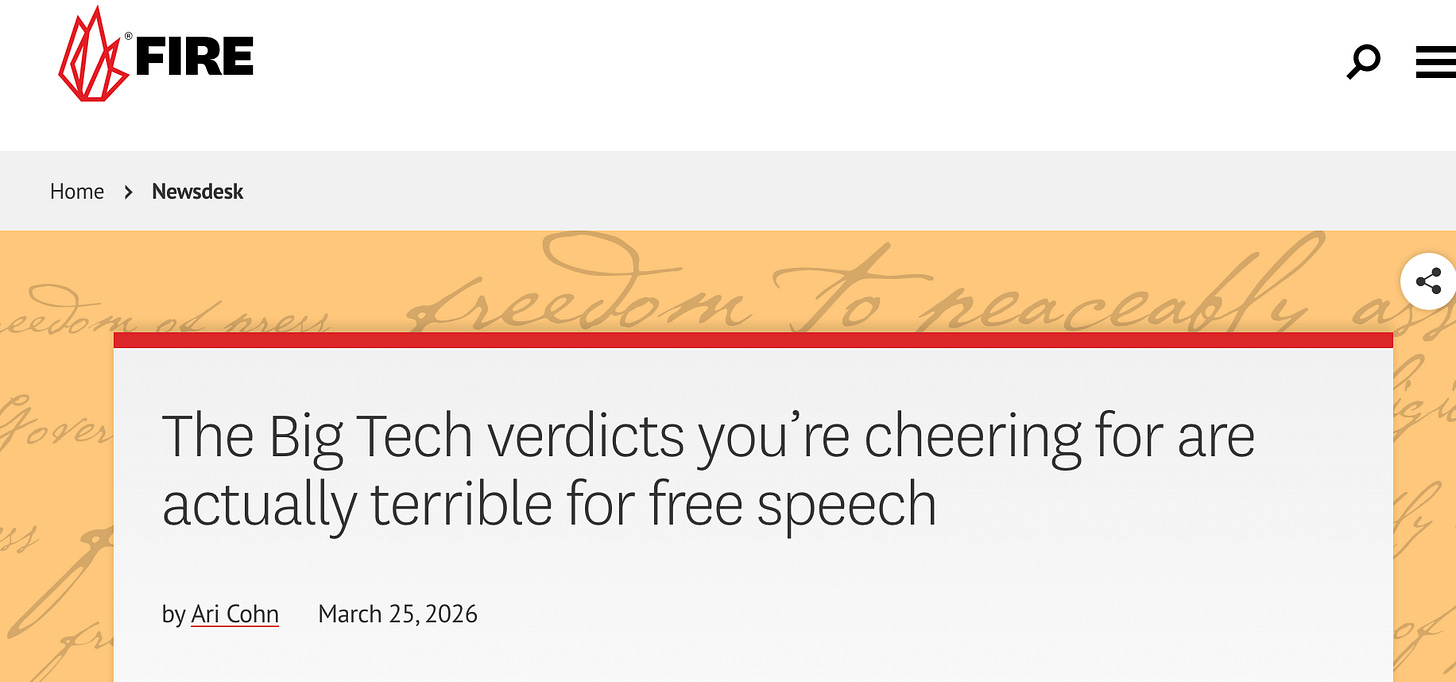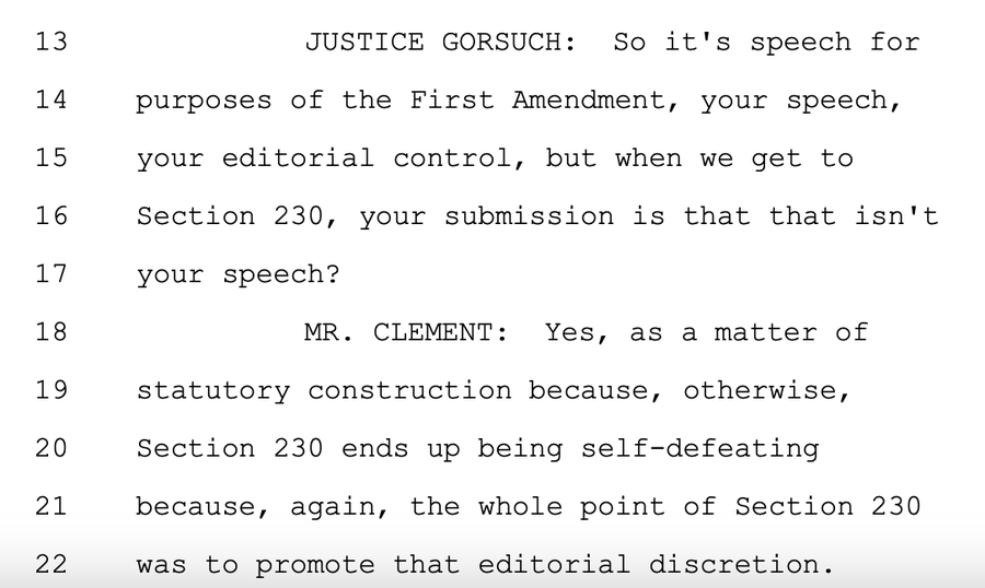 Law works through analogy, and for 30 years, internet law has been understood as a question of speech, and therefore, as revolving around the First Amendment. The network of law professors who have until recently been the intellectual guardians of internet law, are very invested in this analogy. Eric Goldman, co-director of the High Tech Law Institute at the Santa Clara University School of Law, is a good example. In response to this case, he said “I think the internet is on trial, not social media.” Here’s a conservative free speech organization, FIRE, making a similar point.