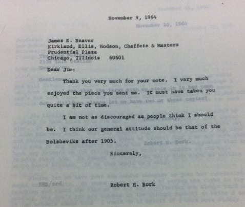 I found this letter in the Bork archives, and it shocked me because it shows just how radical Bork truly was. He hated the mid-20th century American system, and sought to overthrow it, as Lenin had the Russian monarchy.