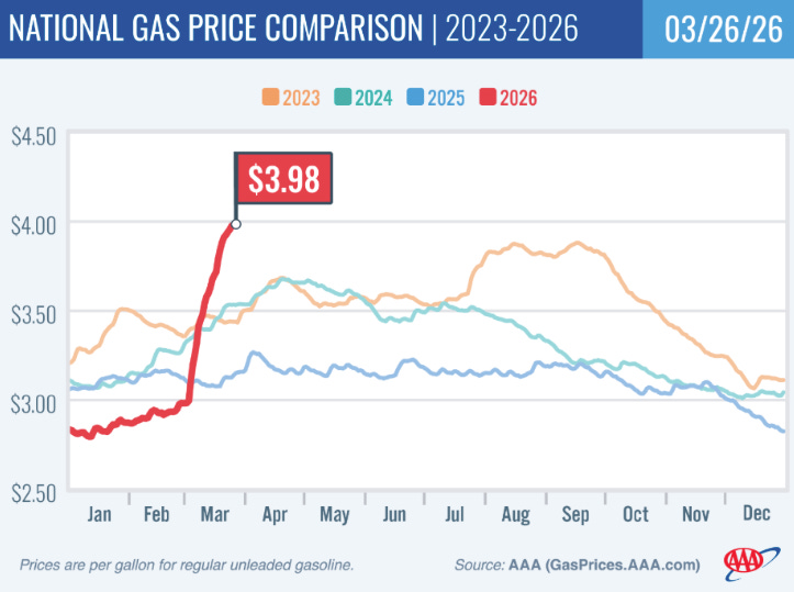 20% of the oil produced globally, as well as large chunks of gas, and fertilizer, come through the Strait of Hormuz. And that waterway is virtually shut, with a tiny fraction of normal traffic coming through. And that’s hitting America, even though the U.S. has our own domestic supply of oil and gas. The price of gasoline, an oil byproduct, jumped by a dollar in the last month. Diesel too is skyrocketing. These are key input costs to transportation, which goes into everything that physically moves.