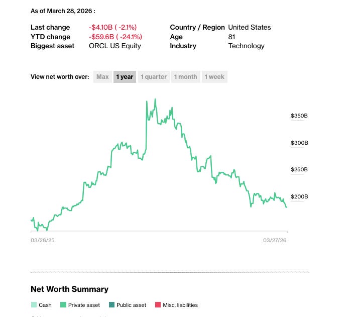 Take one particularly leveraged buy-out that we’re interested in, which is the attempt of Hollywood studio Paramount to buy Warner Brothers. That $110 billion deal is funded by Oracle billionaire Larry Ellison, a host of U.S. private equity funds and banks, and the Saudis and Qataris. When Ellison first bid, his net worth was $388 billion, a shockingly high number. Oracle stock, however, has since cratered. He is now worth “only” $188 billion, down over half since last September, and down $60 billion this year alone.